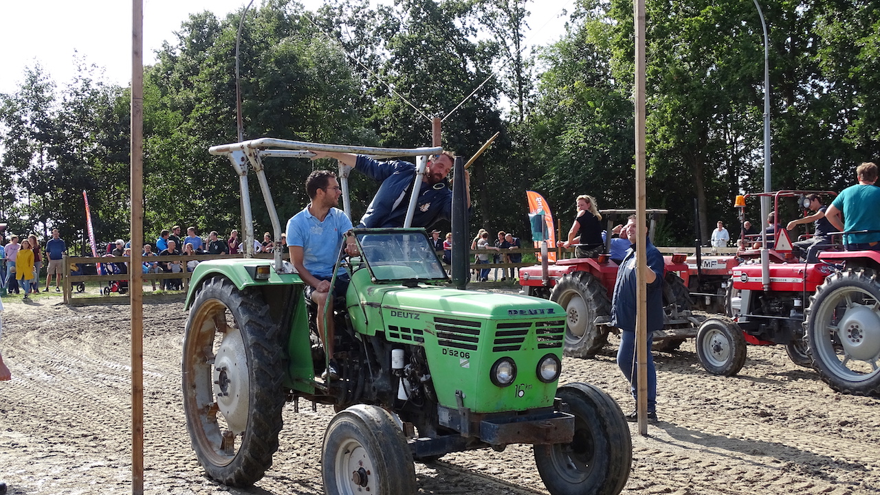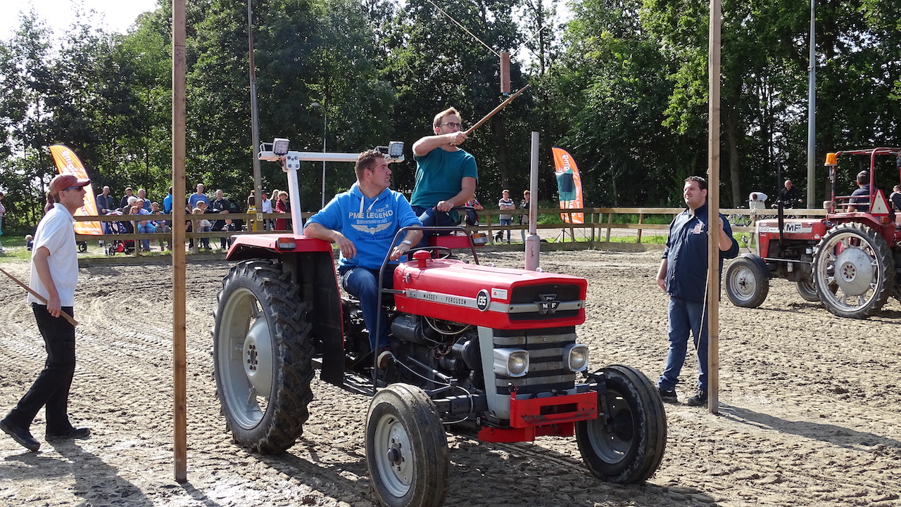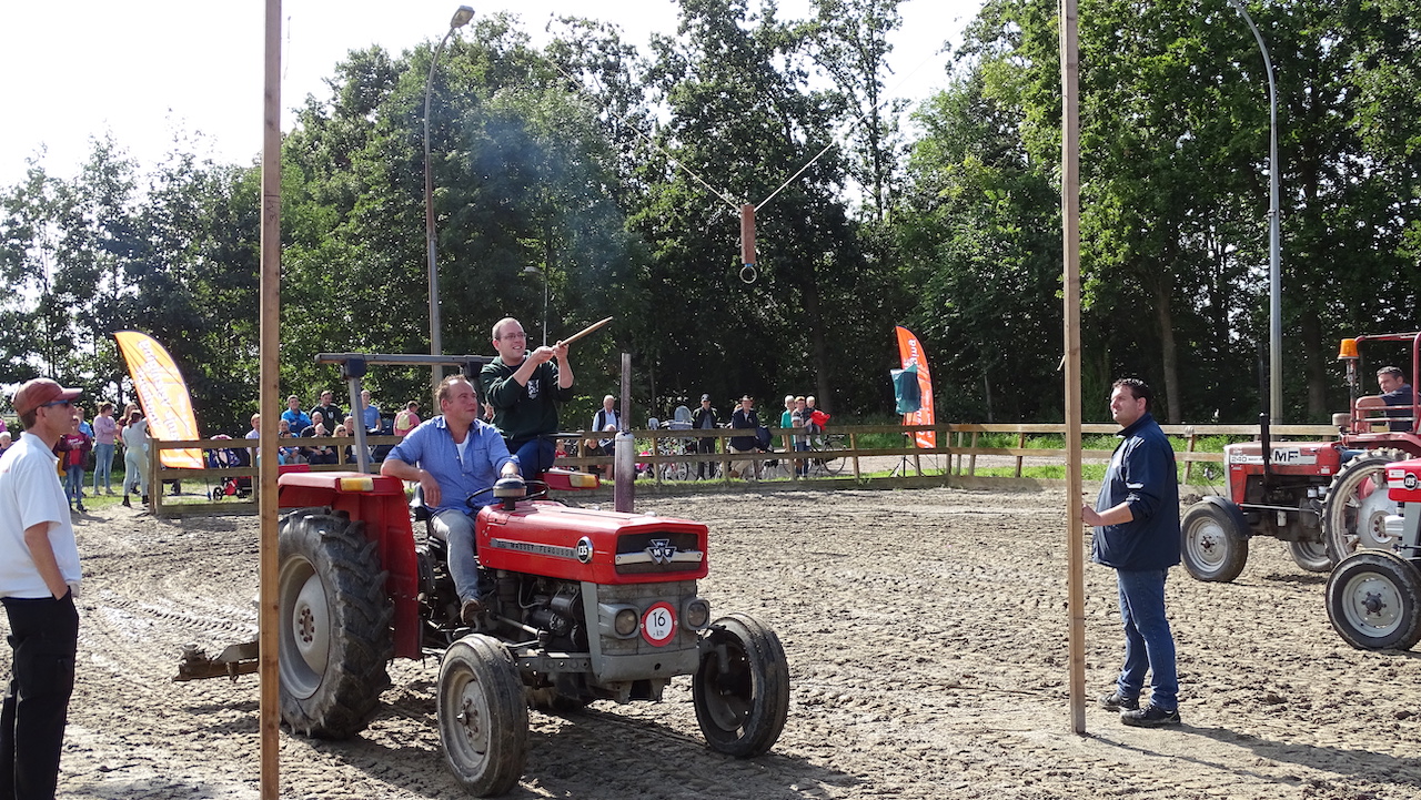 Om 15.00 uur ging het ringsteken met oude tractoren van start. Met 30 deelnemers een druk bezet veld van stekers. Dit jaar waren er 4 tractoren. Robbert, Bas, Leon en Dennis waren bereid gevonden om het parcours met de deelnemers rond te gaan. Er werd gereden over 3 ronden. Het beste totaal uit deze 3 ronden moest een winnaar opleveren. Er werd bijzonder goed gestoken want maar liefst 10 deelnemers hadden na 2 ronden de maximale score behaald. De laatste ronde en de uiterst kleine witte ring zou dus het verschil moeten maken. In deze ronde bleken 7 deelnemers over ijzersterke zenuwen te beschikken en staken beide keren raak. Bas Hijkoop en Jessica van Paridon hadden 6 keer raak gestoken en zouden gaan strijden voor de hoofdprijs en lieten 10 deelnemers achter die in de barrage moesten uitmaken wie met de bronzen medaille aan de haal zou gaan. Er moesten meerdere omlopen gereden worden en uiteindelijk bleek het Bram Piters, die net voor Sjaak Ninaber en Stephan Hoogink het brons wegkaapte. Maar het klapstuk en spektakel werd geleverd door Jessica en Bas. De barrage duurde maar liefst 5 ronden lang. In de 5e ronde miste Bas zijn 2e ring. Jessica rook haar kans schoon en ging onder grote opluchting met luid gejuich over de streep want zij wist beide ringen raak te steken en was daarmee de terechte winnaar. De drie kregen de prijzen uitgereikt door Kees van Rijk die hierbij werd geholpen door Stan Veens.