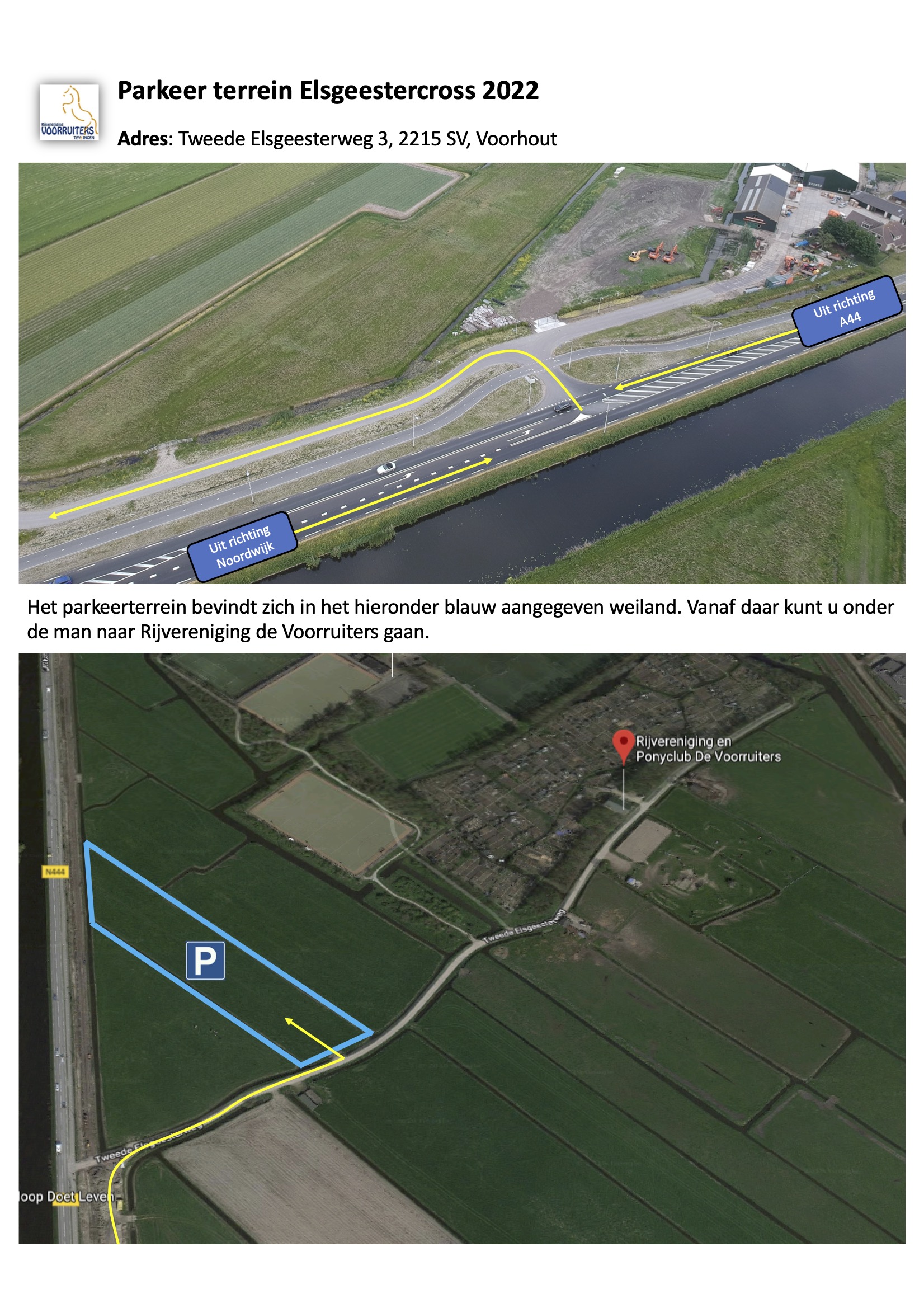 Ook dit jaar is er parkeergelegenheid direct aan de Tweede Elsgeesterweg. Het is mogelijk om hier auto’s en trailers te parkeren, het cross terrein is vlakbij het parkeerterrein. Een plattegrond van het parkeerterrein is hier te vinden. Op de dag van de cross worden parkeerborden geplaatst en is er een parkeerwacht aanwezig.