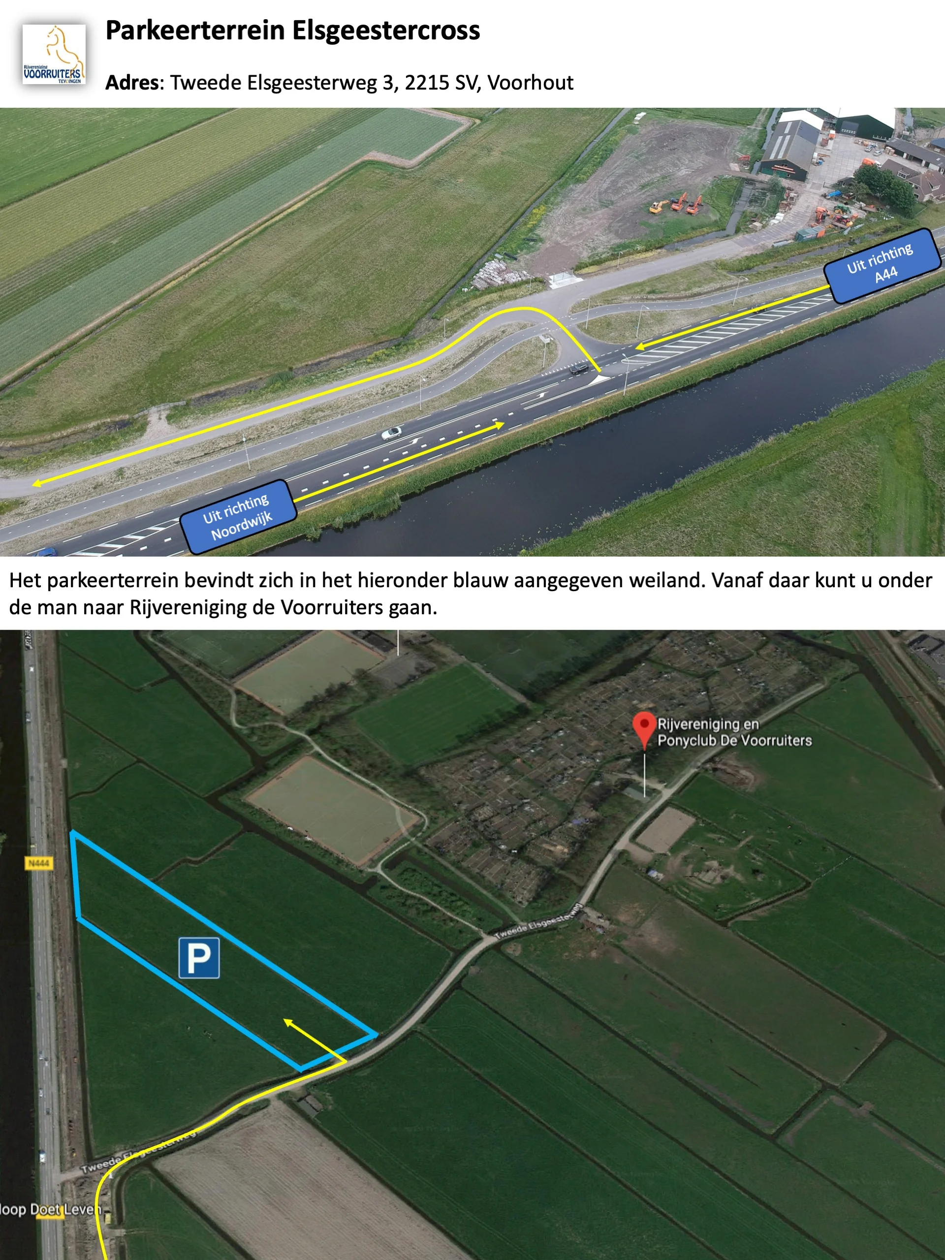 Ook dit jaar is er parkeergelegenheid direct aan de Tweede Elsgeesterweg. Het is mogelijk om hier auto’s en trailers te parkeren, het cross terrein is vlakbij het parkeerterrein. Een plattegrond van het parkeerterrein is hier te vinden. Op de dag van de cross worden parkeerborden geplaatst en is er een parkeerwacht aanwezig.
