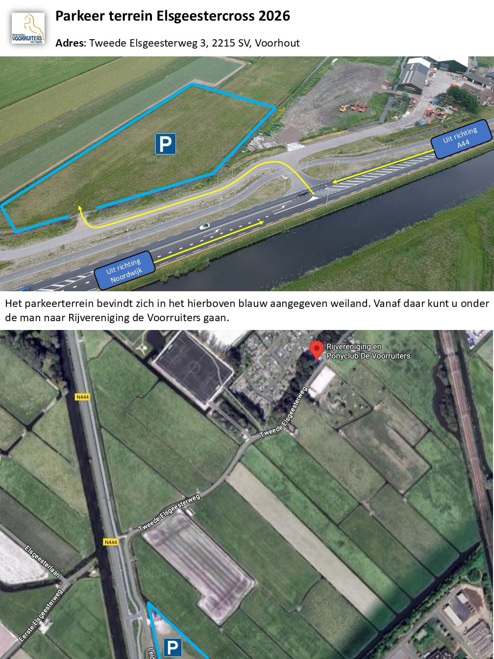 Ook dit jaar is er parkeergelegenheid direct aan de Tweede Elsgeesterweg. Het is mogelijk om hier auto’s en trailers te parkeren, het cross terrein is vlakbij het parkeerterrein. Een plattegrond van het parkeerterrein is hier te vinden. Op de dag van de cross worden parkeerborden geplaatst en is er een parkeerwacht aanwezig.